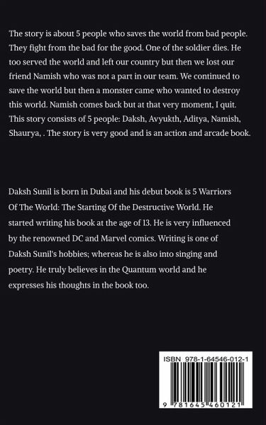 The story is about 5 people who save the world from bad people. They fight from the bad for the good. One of the soldier dies. He too served the world and left our country but then we lost our friend Namish who was not a part in our team. We continued to save the world but then a monster came who wanted to destroy this world. Namish comes back but at that very moment, I quit. This story consists of 5 people: Daksh, Avyukth, Aditya, Namish, Shaurya, . The story is very good and is an action and arcade book.