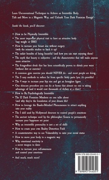 Learn dark feminine strategies almost no woman is using In this book, Ella Demie provides a start-to-finish blueprint for becoming physically and psychologically irresistible. Inside, you'll discover: - How to leverage the Baader-Meinhof Phenomenon to attract anything into your reality - The 4 ways to increase your hip size and get an hourglass figure - The 1 skill used by Hollywood directors to control people's emotions - The 6-ingredient drink that has been scientifically proven to shrink your waist (without diet or exercise) - How to increase your breast size without surgery (with the scientific studies to back it up) - The 12 Dark Feminine Mindsets no one talks about (and why they're the foundation of your ideal life) - The 5 easy methods to reduce fat from specific body parts (yes, it's possible) - The ancient technique used by the philosopher Seneca to permanently increase your happiness set point - The unfair benefits of being beautiful (and how you can start enjoying them) - How to create your own Reality Distortion Field - The most important physical trait to have an attractive body (not weight or BMI) - A counterintuitive way to use vulnerability to raise your social status - The myth that beauty is subjective - and the characteristics that will make anyone more attractive - A common gym exercise you should NEVER do - and most people are doing - One skincare procedure you can do at home that almost no one is taking advantage of (and it would cost thousands of dollars at a clinic) - How to move your body in a magnetic way - Why an irresistible personality is just a set of skills - How to increase your self-awareness and control your emotions - Why emotional reactivity is a secret weapon in dates - And much, much more! Whether you're single or in a relationship, whether you're 20 or 60 years old, the tactics inside this book will change your life.