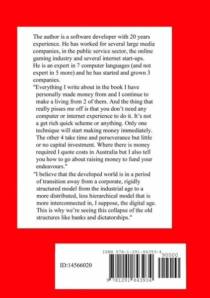 Five legitimate, tried and proven ways to make money online given to you by an IT professional. An insider with real inside knowledge who has personally used these five methods to create an income from the web. Just reading this book you can see a software developer's brain at work. Every chapter fires information at you like bullets. No fluff. No clutter. Just the facts and a little, very dry, humor. Why is he making this information available? There is a confluence of technologies approaching. These are 3-D printing, robotics and AI. These 3 technologies are game changing and will have a profound impact on societies and peoples jobs. The time to secure your future is now. These five ways to make money while you sleep will ensure you can generate an income from anywhere in the world. People need to stop relying on corporations for their lively hood.