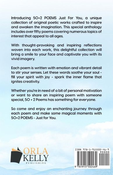 Introducing 50+2 POEMS Just For You, a unique collection of original poetic works crafted to inspire and awaken the imagination. This special anthology includes over fifty poems covering numerous topics of interest that appeal to all ages. With thought-provoking and inspiring reflections woven into each work, this delightful collection will bring a smile to your face and captivate you with its vivid imagery. Each poem is written with emotion and vibrant detail to stir your senses. Let these words soothe your soul - fill your spirit with joy - spark the inner flame that ignites creativity. Whether you're in need of a bit of personal motivation or want to share an inspiring poem with someone special, 50 + 2 Poems has something for everyone. So come and enjoy an enchanting journey through each poem and make some magical moments with 50+2 POEMS - Just for You.