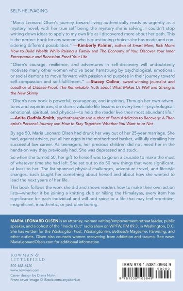 At age 50, Maria Leonard Olsen drank her way out of a 25-year marriage. She had, against advice, put all her eggs in the motherhood basket, willfully derailing her successful law career. As teenagers, her precious children did not need her in the hands-on way they previously had. Her husband and she had grown apart because, among other things, they failed to nurture that important relationship. She was depressed and stuck. When she turned 50, she had the distinct feeling that she was on the downward slope of her life. Actuarially speaking, she was. So when she turned 50, her gift to herself was to go on a crusade to make the most of whatever time she had left. She set out to do 50 new things that were significant, at least to her. The list spanned physical challenges, adventure travel, and lifestyle changes. Each taught her something about herself and about how she wanted to lead the next years of her life to come. This work follows the work she did to accomplish those 50 new things and shows readers how to make their own action lists - whether it be joining a knitting club or hiking the Himalayas, every item has significance for each individual and speaks to her needs and desires. The list is the match to spark the fire that will light the years after 50. Readers will hear about Maria's adventures and the rewards of each. Accomplishing new things, learning new skills, deepening personal and spiritual relationships, and seeking out challenges will add the spice to a life that may feel repetitive, insignificant, inauthentic, or just plain boring.