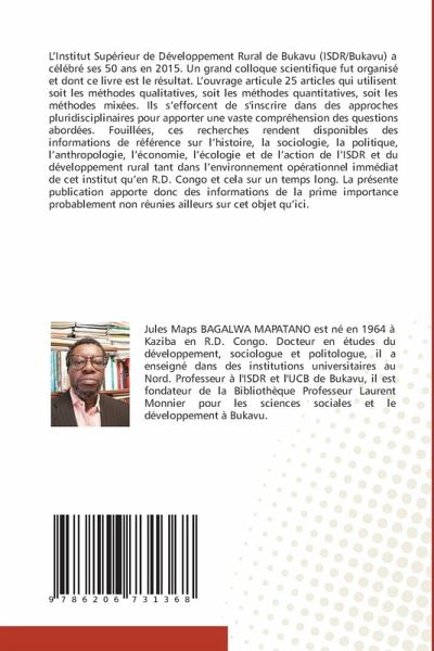 L'Institut Supérieur de Développement Rural de Bukavu (ISDR/Bukavu) a célébré ses 50 ans en 2015. Un grand colloque scientifique fut organisé et dont ce livre est le résultat. L'ouvrage articule 25 articles qui utilisent soit les méthodes qualitatives, soit les méthodes quantitatives, soit les méthodes mixées. Ils s'efforcent de s'inscrire dans des approches pluridisciplinaires pour apporter une vaste compréhension des questions abordées. Fouillées, ces recherches rendent disponibles des informations de référence sur l'histoire, la sociologie, la politique, l'anthropologie, l'économie, l'écologie et de l'action de l'ISDR et du développement rural tant dans l'environnement opérationnel immédiat de cet institut qu'en R.D. Congo et cela sur un temps long. La présente publication apporte donc des informations de la prime importance probablement non réunies ailleurs sur cet objet qu'ici.