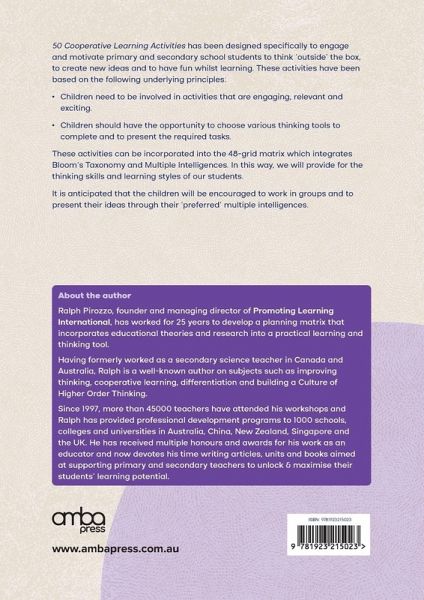 This book has been designed specifically to engage and motivate primary and secondary school students to think 'outside' the box, to create new ideas and to have fun whilst learning. These activities have been based on the following underlying principles:Children need to be involved in activities that are engaging, relevant and exciting. Children should have the opportunity to choose various thinking tools to complete and to present the required tasks. These activities can be incorporated into the 48-grid matrix which integrates Bloom's Taxonomy and Multiple Intelligences. In this way, we will provide for the thinking skills and learning styles of our students. It is anticipated that the children will be encouraged to work in groups and to present their ideas through their 'preferred' multiple intelligences.
