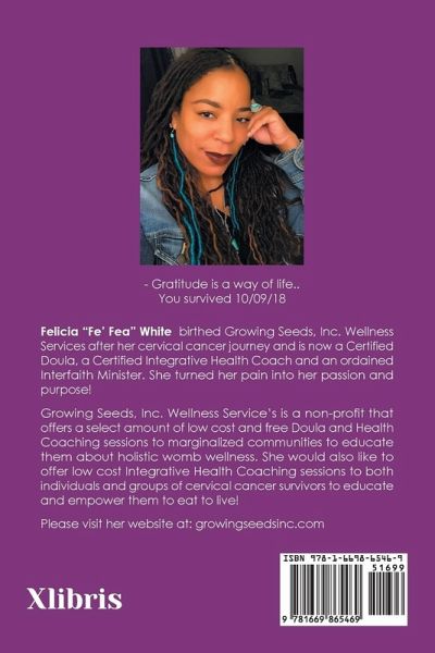 Felicia "Fe' Fea" White birthed Growing Seeds, Inc. Wellness Services after her cervical cancer journey and is now a Certified Doula, a Certified Integrative Health Coach and an ordained Interfaith Minister. She turned her pain into her passion and purpose! Growing Seeds, Inc. Wellness Service's is a non-profit that offers a select amount of low cost and free Doula and Health Coaching sessions to marginalized communities to educate them about holistic womb wellness. She would also like to offer low cost Integrative Health Coaching sessions to both individuals and groups of cervical cancer survivors to educate and empower them to eat to live! Please visit her website at: growingseedsinc.com