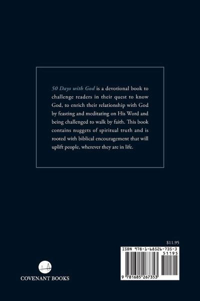 50 Days with God is a devotional book to challenge readers in their quest to know God, to enrich their relationship with God by feasting and meditating on His Word and being challenged to walk by faith. This book contains nuggets of spiritual truth and is rooted with biblical encouragement that will uplift people, wherever they are in life.