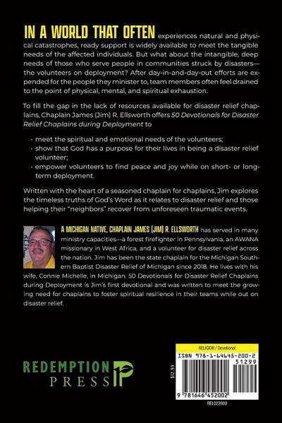 In a world that often experiences natural and physical catastrophes, ready support is widely available to meet the tangible needs of the affected individuals. But what about the intangible, deep needs of those who serve people in communities struck by disasters-the volunteers on deployment? After day-in-and-day-out efforts are expended for the people they minister to, team members often feel drained to the point of physical, mental, and spiritual exhaustion. To fill the gap in the lack of resources available for disaster relief chaplains, Chaplain James (Jim) R. Ellsworth offers 50 Devotionals for Disaster Relief Chaplains during Deployment to · meet the spiritual and emotional needs of the volunteers; · show that God has a purpose for their lives in being a disaster relief volunteer; · empower volunteers to find peace and joy while on short- or long-term deployment. Written with the heart of a seasoned chaplain for chaplains, Jim explores the timeless truths of God's Word as it relates to disaster relief and those helping their "neighbors" recover from unforeseen traumatic events.