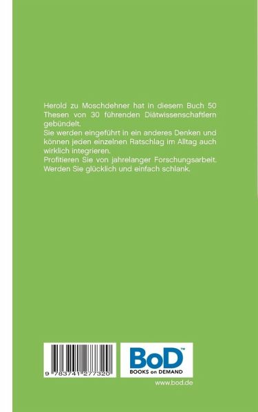 Herold zu Moschdehner hat in diesem Buch 50 Thesen von 30 führenden Diätwissenschaftlern gebündelt. Sie werden eingeführt in ein anderes Denken und können jeden einzelnen Ratschlag im Alltag auch wirklich integrieren.Profitieren Sie von jahrelanger Forschungsarbeit. Werden Sie glücklich und einfach schlank.