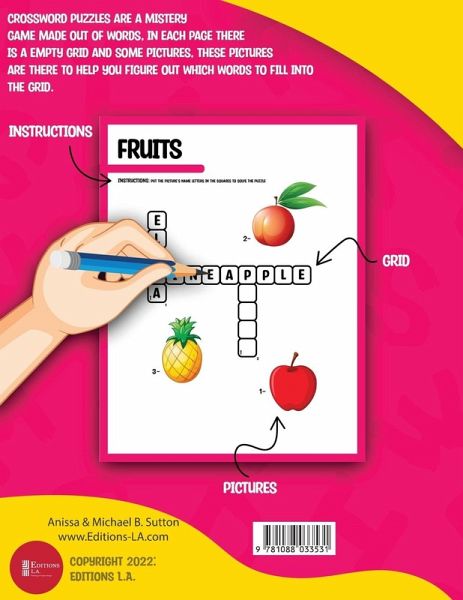 50 pages of easy and fun crossword puzzles for children! Fruits, Vegetables, Animals, Toys and more... Crossword puzzles are a mistery game made out of words, in each page there is a empty grid and some pictures, these pictures are there to help you figure out which words to fill into the grid.