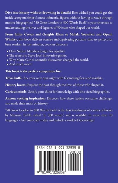 Dive into history without drowning in details! Ever wished you could get the inside scoop on history's most influential figures without having to wade through massive biographies? "50 Great Leaders in 500 Words Each" is your shortcut to understanding the lives and legacies of 50 icons who shaped our world. From Julius Caesar and Genghis Khan to Malala Yousafzai and Oprah Winfrey, this book delivers concise and captivating portraits that are perfect for busy readers. In just minutes, you can discover: How Nelson Mandela fought for equality. The secrets to Steve Jobs' innovative genius. Why Marie Curie's scientific discoveries changed the world. And much more! This book is the perfect companion for: Trivia buffs: Ace your next quiz night with fascinating facts and insights. History lovers: Explore the past through the lives of those who shaped it. Curious minds: Satisfy your thirst for knowledge with bite-sized biographies. Anyone seeking inspiration: Discover how these leaders overcame challenges and made their mark on history. "50 Great Leaders in 500 Words Each" is the first instalment of a series of books by Nietsnie Trebla called "In 500 words", and is available in more than 10 languages - Get your copy today and unlock a world of knowledge!