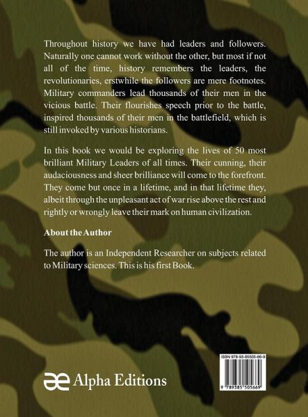 Throughout history we have had leaders and followers. Naturally one cannot work without the other, but most if not all of the time, history remembers the leaders, the revolutionaries, erstwhile the followers are mere footnotes. Military commanders lead thousands of their men in the vicious battle. Their flourishes speech prior to the battle, inspired thousands of their men in the battlefield, which is still invoked by various historians. In this book we would be exploring the lives of 50 most brilliant Military Leaders of all times. Their cunning, their audaciousness and sheer brilliance will come to the forefront. They come but once in a lifetime, and in that lifetime they, albeit through the unpleasant act of war rise above the rest and rightly or wrongly leave their mark on human civilization.