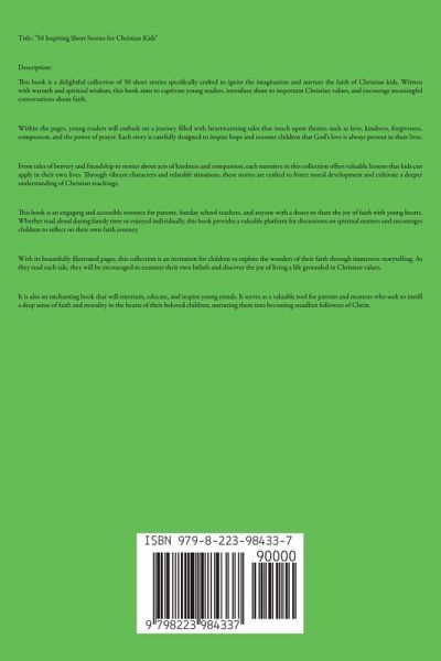 Title: "50 Inspiring Short Stories for Christian Kids" Description: This book is a delightful collection of 50 short stories specifically crafted to ignite the imagination and nurture the faith of Christian kids. Written with warmth and spiritual wisdom, this book aims to captivate young readers, introduce them to important Christian values, and encourage meaningful conversations about faith. Within the pages, young readers will embark on a journey filled with heartwarming tales that touch upon themes such as love, kindness, forgiveness, compassion, and the power of prayer. Each story is carefully designed to inspire hope and reassure children that God's love is always present in their lives. From tales of bravery and friendship to stories about acts of kindness and compassion, each narrative in this collection offers valuable lessons that kids can apply in their own lives. Through vibrant characters and relatable situations, these stories are crafted to foster moral development and cultivate a deeper understanding of Christian teachings. This book is an engaging and accessible resource for parents, Sunday school teachers, and anyone with a desire to share the joy of faith with young hearts. Whether read aloud during family time or enjoyed individually, this book provides a valuable platform for discussions on spiritual matters and encourages children to reflect on their own faith journey. With its beautifully illustrated pages, this collection is an invitation for children to explore the wonders of their faith through immersive storytelling. As they read each tale, they will be encouraged to examine their own beliefs and discover the joy of living a life grounded in Christian values. It is also an enchanting book that will entertain, educate, and inspire young minds. It serves as a valuable tool for parents and mentors who seek to instill a deep sense of faith and morality in the hearts of their beloved children, nurturing them into becoming steadfast followers of Christ.