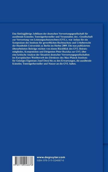 Das fünfzigjährige Jubiläum der deutschen Verwertungsgesellschaft für ausübende Künstler, Tonträgerhersteller und Veranstalter, der "Gesellschaft zur Verwertung von Leistungsschutzrechten (GVL)", war Anlass für ein Symposium des Instituts für gewerblichen Rechtsschutz und Urheberrecht der Humboldt-Universität zu Berlin im Herbst 2009. Die nun publizierten überarbeiteten Beiträge reichen von einem Rückblick des GVL-Beiratsmitgliedes, Komponisten und Dirigenten Peter Ruzicka zur GVL über eine kritische Analyse der Situation deutscher Verwertungsgesellschaften im Europäischen Wettbewerb des Direktors des Max-Planck-Instituts für Geistiges Eigentum Josef Drexl bis zu den Erwartungen, die ausübende Künstler, Tonträgerhersteller und Nutzer an die GVL haben. Die lange stabile Welt der Verwertungsgesellschaften ist in Bewegung geraten. Ausgelöst durch die Online-Musikempfehlung der EU-Kommission und die Forderung nach mehr Wettbewerb haben die Urheberverwertungsgesellschaften für Musik wichtiges Repertoire verloren. Die EU-Kommission erwägt gegenwärtig, die kollektive Rechtewahrnehmung durch Verwertungsgesellschaften in Europa zu harmonisieren. Hierfür gibt der Band wertvolle Anregungen und ist interessant für alle, die sich sei es als Praktiker oder Wissenschaftler mit der kollektiven Rechtewahrnehmung oder dem Leistungsschutzrecht beschäftigen.