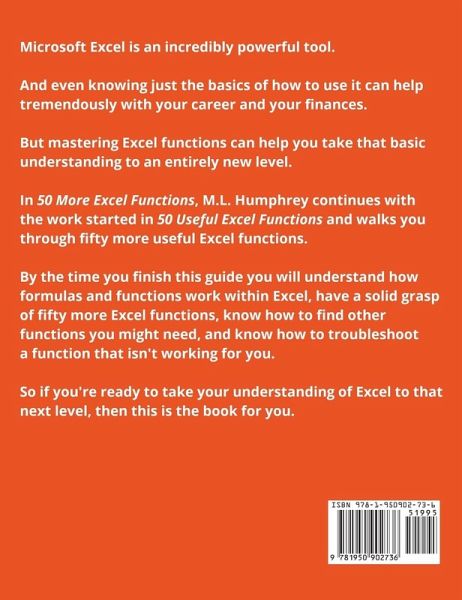 Microsoft Excel is an incredibly powerful tool. And even knowing just the basics of how to use it can help tremendously with your career and your finances. But mastering Excel functions can help you take that basic understanding to an entirely new level. In 50 More Excel Functions, M.L. Humphrey continues with the work started in 50 Useful Excel Functions and walks you through fifty more useful Excel functions. By the time you finish this guide you will understand how formulas and functions work within Excel, have a solid grasp of fifty more Excel functions, know how to find other functions you might need, and know how to troubleshoot a function that isn't working for you. So if you're ready to take your understanding of Excel to that next level, then this is the book for you.