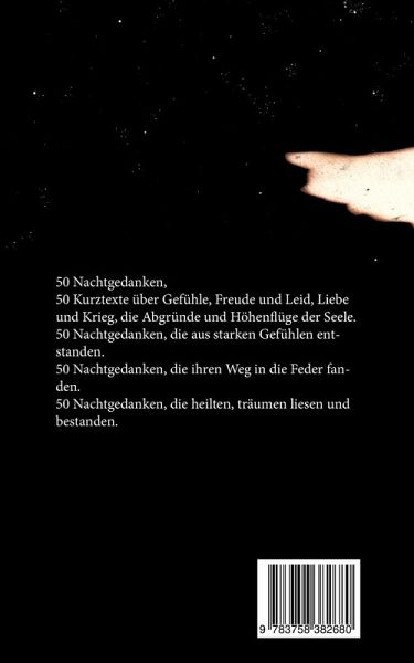 50 Nachtgedanken, 50 Kurztexte über Gefühle, Freude und Leid, Liebe und Krieg, die Abgründe und Höhenflüge der Seele. 50 Nachtgedanken, die aus starken Gefühlen entstanden. 50 Nachtgedanken, die ihren Weg in die Feder fanden. 50 Nachtgedanken, die heilten, träumen liesen und bestanden.