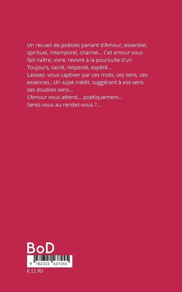 Un recueil de poésies parlant d'Amour, essentiel, spirituel, intemporel, charnel... Cet amour vous fait naître, vivre, revivre à la poursuite d'un Toujours, sacré, respecté, espéré... Laissez -vous captiver par ces mots, ces sens, ces essences...Un sujet inédit, suggérant à vos sens ses doubles sens... L'Amour vous attend... poétiquement...Serez-vous au rendez-vous ?...