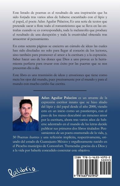 Este listado de poemas es el resultado de una inspiración que ha sido forjada tras varios años de haberse encariñado con el lápiz y el papel, el poeta Adan Aguilar Palacios; Es una serie de textos que pretende sacar a flote todo el romanticismo que se lleva en las entrañas cuando se es correspondido, toda la melancolía que produce el resultado de una decepción y toda la creatividad obtenida tras amaestrar al pensamiento. En estas setenta páginas se encierra un cúmulo de ideas las cuales han sido diseñadas no solo para llegar al corazón de los lectores, sino también para promover el amor a la escritura y a la expresión. Saber hacer uso de los dones que Dios a uno provee es la herramienta perfecta para cruzar con éxito por las puertas que se nos presentan día a día. Este libro es una trasmisión de ideas y emociones que tiene como meta los ojos del mundo, pues precisamente por el mundo y para el mundo con mucho cariño fue escrito.