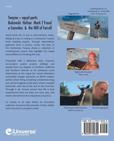Twayne = equal parts: Bukowski Hefner Mark T Freud e-Snowden & the Will of Ferrell Whether he is on a mountain hike, sitting at a bar, or eating in a restaurant, Twayne loves meeting people. Through observations gathered from a journey across the best of the Southwest, Twayne shares a collection of contemporary poems that highlight the varied personalities he met along the way. Presented with a distinctive style, Twayne's provocative poems explore settings and people from Los Angeles to Northern California and Northern Arizona as he witnesses social interactions at the rogue bar where televisions outnumber Dodger pennants; at Bel-Air solstice parties where living, breathing cemetarians hang out, and an imaginary sushi place where a tousled bushy-hair cutie sits at the end of the food bar. Through it all, Twayne proves that life is best experienced when we open our eyes, ears, and hearts and embrace the uniqueness around us. 50 Scenes in 58 days shares an innovative collection of poems that presents a fresh, artistic look at society in a modern world.