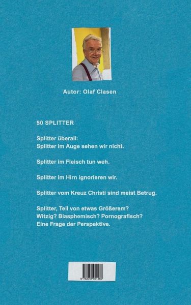 50 gewagte Gedankensplitter: Splitter überall. Splitter im Auge- übersehen wir. Splitterim Fleisch - tun weh. Splitter im Hirn- ignorieren wir. Splitter vom Kreuz Christ- sind fas immer Betrug.Splitter, Teil von etwas Größerem?Witzig? Blasphemism? Pornografisch?Immer eine Frage der Perspektive.