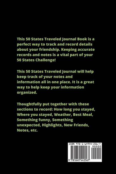 This 50 States Travel Journal notebook is a perfect way for you to record and keep track of which states you have been to or visited. Each state has two pages with space and prompts to write places you have visited including sections to record: How Long You Stayed - Write how long your trip was. Where You Stayed - Log the place you stayed. Weather - Record what the weather was like. Best Meal - Write what your best meal of the trip was. Something Funny - Log anything funny that happened. Something Unexpected - Record something that happened that was unexpected. Highlights of the Trip - Write the highlights of your trip. What Did You Learn - Log anything you may have learned. Did You Make New Friends - Record any new friends you made. Why Did You Visit The State - Write why you came to the state. Notes - Blank lined notes for writing memories, fun things you did on vacation or just traveling through, etc. Rating of the State - Rate the state from 1-10. Great for men and women, boys and girls alike. Use as a diary of your travels. Simple and easy to use. Also makes a great gift for anyone who loves to travel the USA. Also includes a contact page. Size is 6x9 inches, 104 pages, white paper, soft matte finish cover, paperback.
