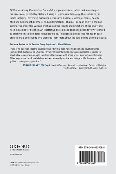 50 Studies Every Psychiatrist Should Know presents key studies that have shaped the practice of psychiatry. Selected using a rigorous methodology, the studies cover topics including: psychotic disorders, depressive disorders, women's mental health, child and adolescent disorders, and epidemiological studies. For each study, a concise summary is presented with an emphasis on the results and limitations of the study, and its implications for practice. An illustrative clinical case concludes each review, followed by brief information on other relevant studies. This book is a must-read for health care professionals and anyone who wants to learn more about the data behind clinical practice.