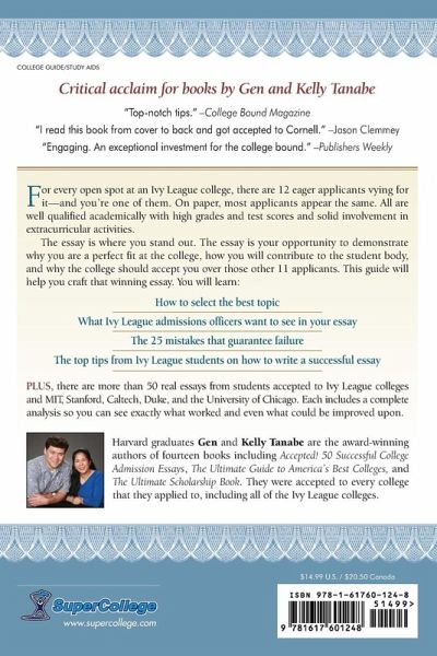 For every open spot at an Ivy League college, there are 10 to 12 eager applicants vying for it—and you’re one of them. On paper, most applicants appear the same. All are well qualified academically with high grades and test scores and solid involvement in extracurricular activities. The essay is where you stand out. The essay is your opportunity to demonstrate why you are a perfect fit at the college, how you will contribute to the student body, and why the college should accept you over those other 11 applicants. This guide will help you craft that winning essay. You will learn: 1. How to select the best topic 2. What Ivy League admissions officers want to see in your essay 3. The 25 mistakes that guarantee failure 4. The top tips from Ivy League students on how to write a successful essay PLUS, there are more than 50 real essays from students accepted to Ivy League colleges and MIT, Stanford, Caltech, Duke, and the University of Chicago. Each includes a complete analysis so you can see exactly what worked and even what could be improved upon.