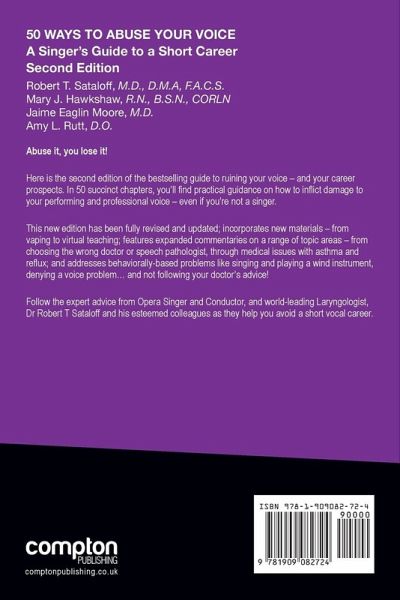 Abuse it, you lose it! Here is the second edition of the bestselling guide to ruining your voice - and your career prospects. In 50 succinct chapters, you'll find practical guidance on how you risk damage to your performing and professional voice - even if you're not a singer. This new edition has been fully revised and updated; incorporates new materials - from vaping to virtual teaching; features expanded commentaries on a range of topic areas - from choosing the wrong doctor or speech pathologist, through medical issues with asthma and reflux; and addresses behaviorally-based problems like singing and playing a wind instrument, denying a voice problem... and not following your doctor's advice! Follow the expert advice from Opera Singer and Conductor, and world-leading Laryngologist, Dr Robert T Sataloff and his esteemed colleagues as they help you avoid a short vocal career.