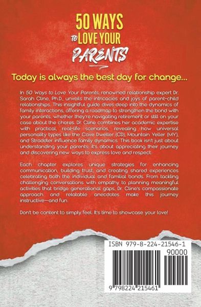 Are you ready to unlock the secrets of a fulfilling and enriching parent-child relationship? In her groundbreaking book, "50 Ways to Love Your Parents," Dr. Sarah Cline, a renowned relationship expert, delves into the complexities of family dynamics. This essential guide offers a comprehensive roadmap to deepen and strengthen your bond with your parents, irrespective of life stages. Whether they are adapting to retirement or still reminding you about household responsibilities, Dr. Cline's book is a treasure trove of insights. Combining academic wisdom with practical scenarios, it reveals how personality types play a pivotal role in family interactions. More than just understanding your parents, this book is a journey towards appreciating their life stories and finding novel ways to express love and respect. Dr. Cline's book is a masterclass in family communication, trust-building, and creating cherished, shared experiences. Each chapter is a step towards enhancing dialogue, empathizing during tough talks, and planning activities that connect generations. Dr. Cline's compassionate advice, paired with engaging anecdotes, ensures that readers not only learn but also enjoy the process of strengthening family bonds. Whether you're looking to bridge a gap or simply want to show your parents how much you care, "50 Ways to Love Your Parents" is your go-to guide for a more loving, understanding, and fun-filled family relationship.