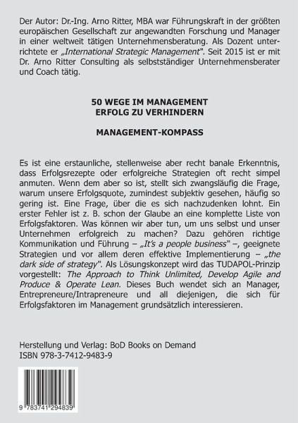 Es ist eine erstaunliche, stellenweise aber recht banale Erkenntnis, dass Erfolgsrezepte oder erfolgreiche Strategien oft recht simpel anmuten. Wenn dem aber so ist, stellt sich zwangsläufig die Frage, warum unsere Erfolgsquote, zumindest subjektiv gesehen, häufig so gering ist. Eine Frage, über die es sich nachzudenken lohnt. Ein erster Fehler ist z. B. schon der Glaube an eine komplette Liste von Erfolgsfaktoren. Was können wir aber tun, um uns selbst und unser Unternehmen erfolgreich zu machen? Dazu gehören richtige Kommunikation und Führung - It is a people business -, geeignete Strategien und vor allem deren effektive Implementierung - the dark side of strategy. Als Lösungskonzept wird das TUDAPOL-Prinzip vorgestellt: The Approach to Think Unlimited, Develop Agile and Produce & Operate Lean. Dieses Buch wendet sich an Manager, Entrepreneure/Intrapreneure und all diejenigen, die sich für Erfolgsfaktoren im Management grundsätzlich interessieren.