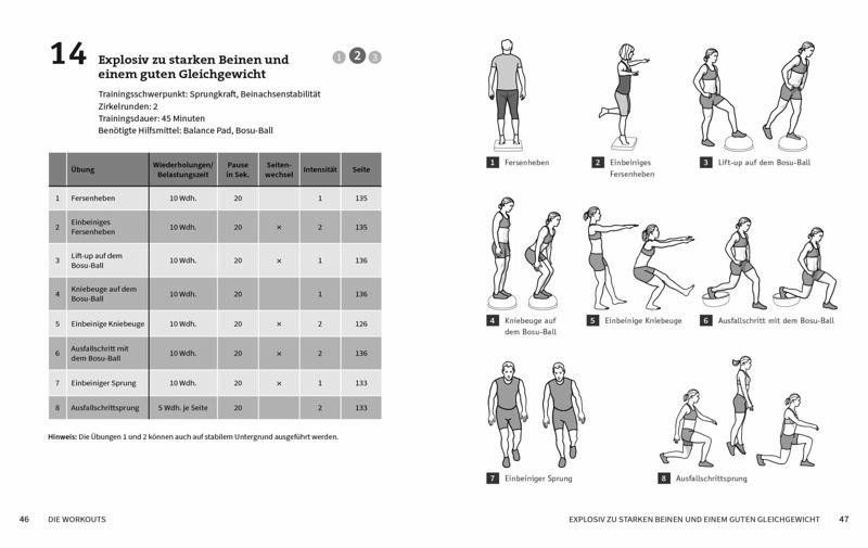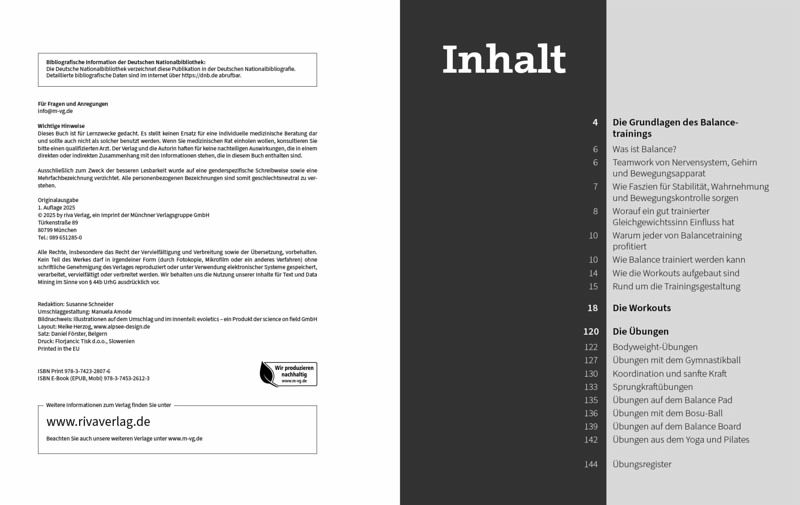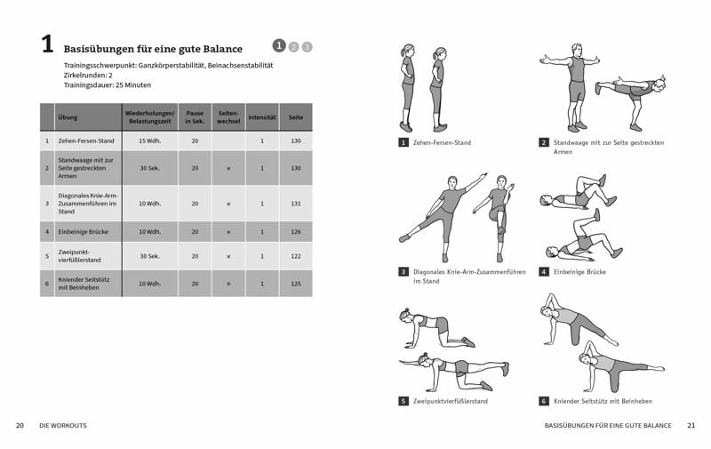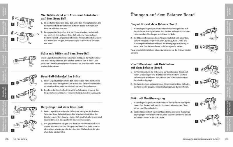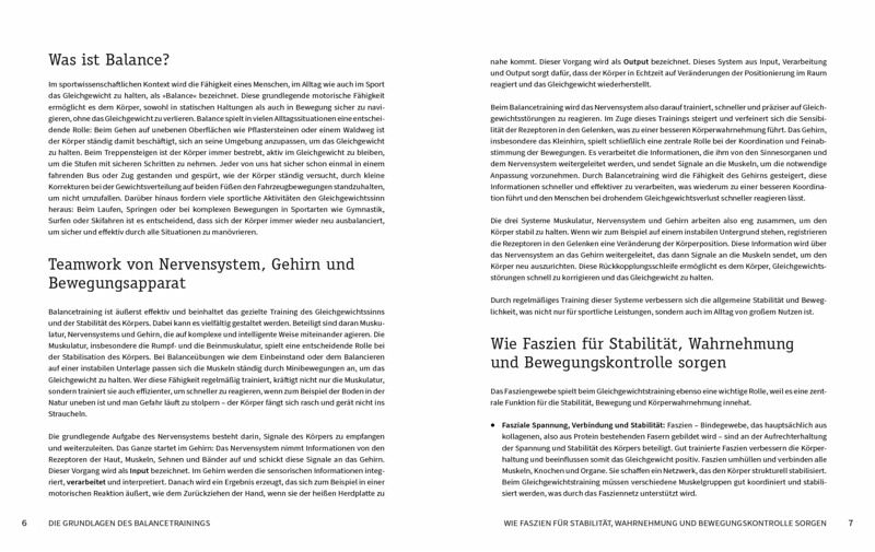 Ohne Balance geht nichts!Wenn du aufrecht durchs Leben gehen, alltägliche Aktivitäten problemlos umsetzen, Stürzen vorbeugen oder deine sportliche Leistung verbessern willst, solltest du deswegen auf Balancetraining setzen. Damit förderst du Stabilität, Beweglichkeit und Koordination, stärkst die Tiefenmuskulatur und schulst kognitive Fähigkeiten.50 effektive Übungsreihen helfen dir, Gleichgewichtssinn und Stabilität gezielt zu trainieren. Perfekt dafür geeignet sind diese Geräte:- Balance Board: Das Brett auf einer Halbkugel oder einem Zylinder, das hin- und herschaukelt, stärkt besonders deine Tiefenmuskulatur, vor allem bei Übungen wie Liege- oder Seitstütz.- Balance Pad oder Balancekissen: Auf dieser Art von Kissen aus schaumstoffartigem Material trainierst du ideal den Einbeinstand oder das Fersenheben.- Bosu-Ball: Den halbkugelförmigen Ball mit fester flacher Unterseite kannst du auf beiden Seiten verwenden. Ob für Kniebeugen, Ausfallschritte oder Stützvarianten - lass deiner Fantasie freien Lauf!- Gymnastikball: Von Liegestütz über Beckenheben bis zum freien Kniestand auf dem Ball - wackelig und herausfordernd wird es hier für dich definitiv!Übungen mit dem eigenen Körpergewicht sowie aus dem Yoga und Pilates bringen zusätzlich Abwechslung in deine Trainingseinheiten. Die Workouts mit maximal 45 Minuten sind für jedes Alter und Fitnesslevel geeignet und machen obendrein jede Menge Spaß!