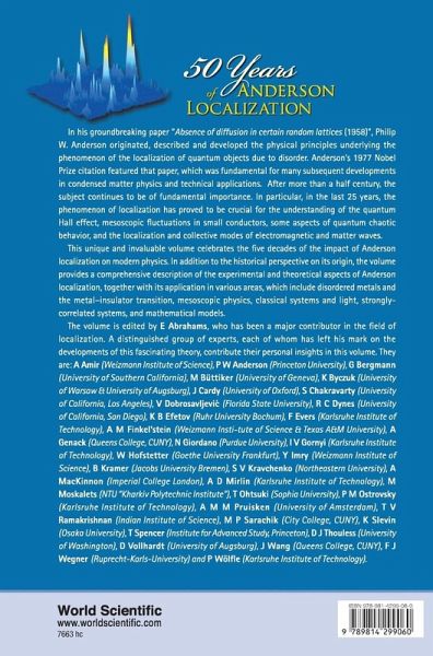 In his groundbreaking paper "Absence of diffusion in certain random lattices (1958)," Philip W. Anderson originated, described and developed the physical principles underlying the phenomenon of the localization of quantum objects due to disorder. Anderson's 1977 Nobel Prize citation featured that paper, which was fundamental for many subsequent developments in condensed matter theory and technical applications. After more than a half century, the subject continues to be of fundamental importance. In particular, in the last 25 years, the phenomenon of localization has proved to be crucial for the understanding of the Quantum Hall Effect, mesoscopic fluctuations in small conductors, some aspects of quantum chaotic behavior, and most recently the localization and collective modes of electromagnetic and matter waves. This unique and invaluable volume celebrates the five decades of the impact of Anderson Localization on modern physics. In addition to the historical perspective on its origin, the volume provides a comprehensive description of the experimental and theoretical aspects of Anderson localization, together with its application in various areas, which include disordered metals and the metal-insulator transition, mesoscopic physics, classical systems and light, strongly-correlated systems, and mathematical models. The volume is edited by E. Abrahams, who, as a major contributor in the field of localization, has published several papers on the celebrated scaling theory of localization. A distinguished group of experts, each of whom has left his mark on the developments of this fascinating theory, contribute their personal insights in this volume. They are: P.W. Anderson (Nobel Laureate, 1977), G. Bergmann (University of Southern California), M. Buttiker (University of Geneva), J. Cardy (Oxford University), S. Chakravarty (University of California, Los Angeles), V. Dobrosavljevic (Florida State University), R.C. Dynes (University of California, San Diego), K.B. E