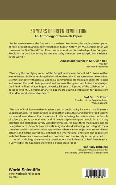 The green revolution in India about 50 years ago transformed India's image then as begging bowl to bread basket. This transformation during the 1960s took just about 4 years. The yield increases achieved in wheat and then in rice which occurred in just about half decade is far in excess of the yield increases during the preceding 4000 years. This remarkable feat was achieved with the leadership of the author using the dwarf wheat types which had been produced by Norman Borlaug in Mexico. The research and development of green revolution of wheat and rice at the Indian Agricultural Research Institute, New Delhi was led by the author along with his team of students and co-workers. He has published over 100 papers on green revolution and the ever-green revolution which is a refinement of the former. This book is a compilation of just about 40 of his numerous research papers, monographs and books published by him on this subject. The papers in this book bring out the scientific basis of the modification of the plant type so as to be responsive to exogenous addition of chemical fertilizers and irrigation. The ideal plant type enables capture of adequate sunlight and using the chemical fertilizers added to the soil, produce substantial photosynthetic starch. And because the plants have short and thick culm, they are able to withstand enormous amounts of grains in their ears. This indeed was the basis of breaking the yield barriers associated with native varieties. The book also brings out that green revolution had established the food security at the national level but not at the individual household levels of millions of resource-poor rural small and marginal farming, fishing and landless families. Further green revolution was commodity-centric and the manner of its practice led to environmental degradation and social inequities. This author realized as early as 1972 that system of agriculture in India should be designed to fight both the famines of food and rural livelihoods. In pursuit of it, this author further designed an evergreen revolution with systems approach. What this means is providing concurrent attention to ecological foundations of agriculture and the livelihoods of the rural people. The book also brings out that green revolution was a team effort involving scientists, policy makers, administrators, farmers and students. This book is an outstanding example of green revolution providing a breathing space by putting the cereal grain production rate ahead of the population growth rate and then when food security has been adequately established, the system is changed to achieve productivity in perpetuity without causing environmental and social harm.