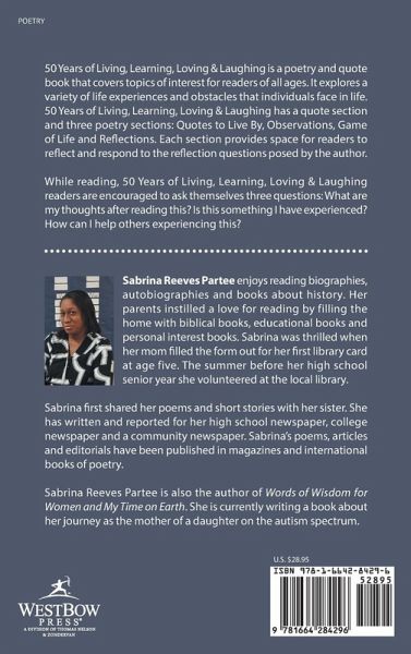 50 Years of Living, Learning, Loving & Laughing is a poetry and quote book that covers topics of interest for readers of all ages. It explores a variety of life experiences and struggles that individuals face in life. 50 Years of Living, Learning, Loving & Laughing has a quote section and three poetry sections: Quotes to Live By, Observations, Game of Life and Reflections. Each section provides space for readers to reflect and respond to the reflection questions posed by the author. While reading, 50 Years of Living, Learning, Loving & Laughing readers are encouraged to ask themselves three questions: What are my thoughts after reading this? Is this something I have experienced? How can I help others experiencing this?