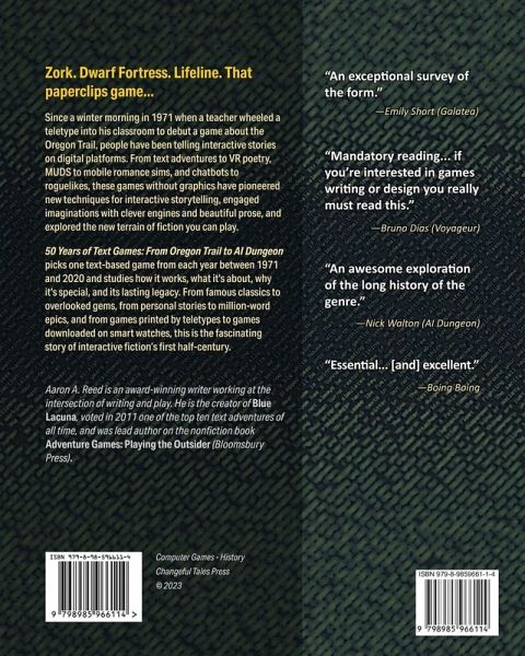 Since a winter morning in 1971 when a teacher wheeled a teletype into his classroom to debut a game about the Oregon Trail, people have been telling interactive stories on digital platforms. From text adventures to VR poetry, MUDS to mobile romance sims, and chatbots to roguelikes, these games without graphics have pioneered new techniques for interactive storytelling, engaged imaginations with clever engines and beautiful prose, and explored the new terrain of fiction you can play. 50 Years of Text Games: From Oregon Trail to AI Dungeon picks one text-based game from each year between 1971 and 2020 and studies how it works, what it's about, why it's special, and its lasting legacy. From famous classics to overlooked gems, from personal stories to million-word epics, and from games printed by teletypes to games downloaded on smart watches, this is the fascinating story of interactive fiction's first half-century.