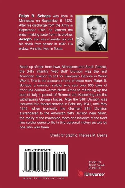 Made up of men from Iowa, Minnesota and South Dakota, the 34th Infantry "Red Bull" Division was the first American division to sail for European Service in World War II. This is the account of one of these men, Ralph B. Schaps, a common soldier who saw over 500 days of front line combat - from North Africa to marching up the boot of Italy in pursuit of Rommel and Kesselring and the withdrawing German forces. After the 34th Division was inducted into federal service in February 1941, until May 1945, when ironically the German 34th Division surrendered to the American 34th Division near Milan, the reality of the hardships, fears and heroism of the front line soldier come to life in this personal history as told by one who was there.