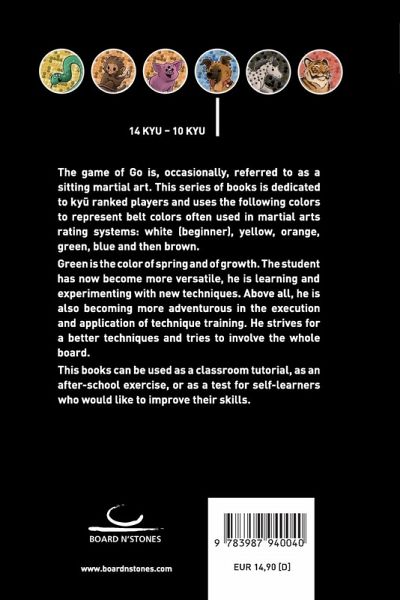 The game of Go is, occasionally, referred to as a sitting martial art. This series of books is dedicated to kyu ranked players and uses the following colors to represent belt colors often used in martial arts rating systems: white (beginner), yellow, orange, green, blue and then brown. Green is the color of spring and of growth. The student has now become more versatile, he is learning and experimenting with new techniques. Above all, he is also becoming more adventurous in the execution and application of technique training. He strives for a better techniques and tries to involve the whole board. This books can be used as a classroom tutorial, as an after-school exercise, or as a test for self-learners who would like to improve their skills.