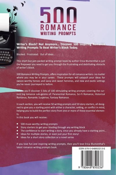 Writer's Block? Not Anymore... Discover 500 Inspiring Romance Writing Prompts To Beat Writer's Block Today. Blocked. Frustrated. Out of Ideas... This short-but-jam-packed writing prompt book by author Erica Blumenthal is just the firepower you need to get you through the frustrating and debilitating obstacle of writer's block. 500 Romance Writing Prompts, offers inspiration for all romance writers - no matter where you may be in your career. These prompts will catapult your ideas for swoon-worthy heroes and sassy and sweet heroines, and new and exotic settings you've never journeyed to before. Inside, you'll discover 5 lists of 100 stimulating writing prompts covering the current big romance sub-genres of: Paranormal Romance, Sci-Fi Romance, Historical Romance, Romantic Suspense, Fantasy Romance. In each section, you will receive 50 writing prompts and 50 story starters, all designed to give you a starting point with either a character, setting, or conflict in mind, helping you to build the perfect story from one or more of these essential elements. In this book you will receive: · 500 muse-worthy writing prompts · Story starters to get you blasting through any writing block · The confidence to start writing a story, since you already have a starting point... · Ideas for multiple stories, or even just your first story! · Ideas for a short story collection or novel series If you love fun and inspiring writing prompts, then you'll love Erica Blumenthal's latest romance writing prompts book.