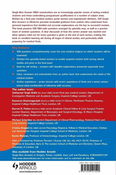 Single Best Answer (SBA) examinations are an increasingly popular means of testing medical students and those undertaking postgraduate qualifications in a number of subject areas. Written by a final year medical student, junior doctors and experienced clinicians, 500 Single Best Answers in Medicine provides invaluable guidance from authors who understand from personal experience that detailed and accurate explanations are the key to successful revision. This book presents 500 SBA-style questions arranged by specialty area as well as a practice exam of random questions. A clear discussion of how the correct answer was reached and other options ruled out for every question is given at the end of each section, making this book an excellent learning aid during all stages of clinical studies, and particularly while preparing for medical finals.