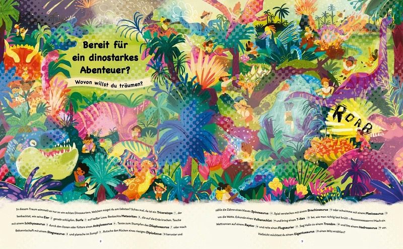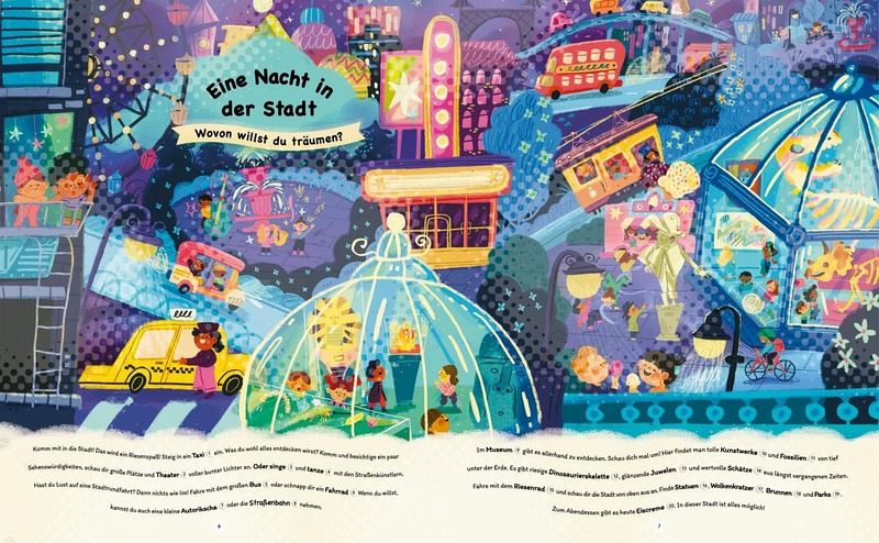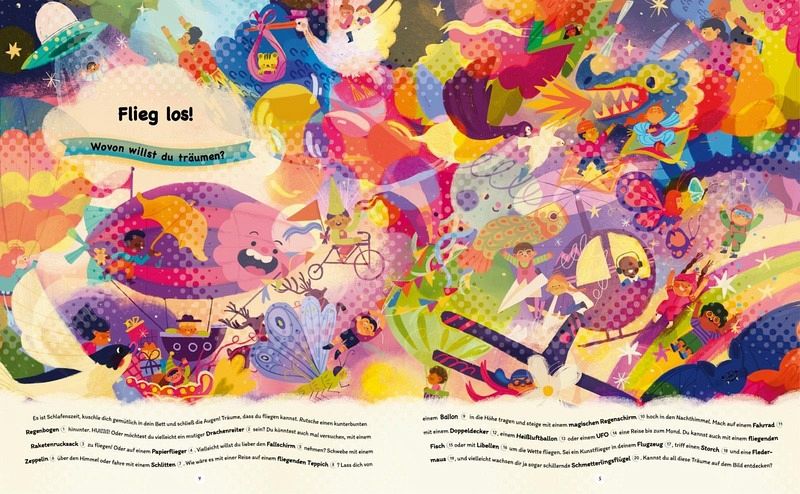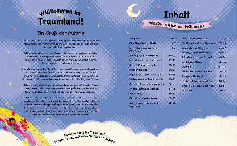 500 Träume warten nur darauf, von neugierigen Nachtschwärmer_innen entdeckt zu werden! In den magischen Traumwelten kann sich jedes Kind aussuchen, ob es auf einem Drachen fliegen, einen Marshmallow-Berg erklimmen, Freundschaften mit Meerjungfrauen schließen oder mit einer Rakete durchs Weltall sausen möchte. Jede Seite lädt dazu ein, 20 fantastische Abenteuer zu erleben. So haben Albträume keine Chance mehr und das Zubettgehen wird zum Lieblingsmoment des Tages.