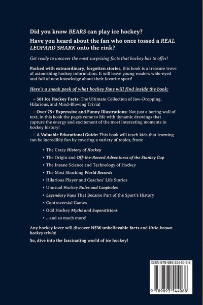 Did you know BEARS can play ice hockey? Have you heard about the fan who once tossed a REAL LEOPARD SHARK onto the rink? Get ready to uncover the most surprising facts that hockey has to offer! Packed with extraordinary, forgotten stories, this book is a treasure trove of astonishing hockey information. It will leave young readers wide-eyed and full of new knowledge about their favorite sport! Here's a sneak peek of what hockey fans will find inside the book: - 501 Ice Hockey Facts: The ultimate collection of jaw-dropping, hilarious, and mind-blowing trivia! - Over 75+ Expressive and Funny Illustrations: Not just a boring wall of text, in this book the pages come to life with dynamic drawings that capture the energy and excitement of the most interesting moments in hockey history! - A Valuable Educational Guide: This book will teach kids that learning can be incredibly fun by covering a variety of topics, from:The Crazy History of Hockey The Origin and Off-the-Record Adventures of the Cup The Insane Science and Technology of Hockey The Most Shocking World Records Hilarious Player and Coaches' Life Stories Unusual Hockey Rules and Loopholes Legendary Fans That Became Part of the Sport's History Controversial Games Odd Hockey Myths and Superstitions ...and so much more! - Hours of Screen-Free Entertainment: This addictive book is an easy way to get kids to stop looking at their phones and get into the wonderful habit of reading by engaging their curiosity about a topic they love! - An Inspirational Resource: Did you know that the player who scored the most goals ever in a Cup game was blind in one eye? - A Fun and Social Conversation Starter: After learning a surprising new fact, no one can resist the urge to share it with their friends! - A Powerful Motivator to Exercise: By reading about the incredible feats of their favorite players, children will be inspired to pick up a hockey stick, go outside, and start playing! Any hockey lover will discover NEW unbelievable facts and little-known hockey trivia! If you know someone who eagerly soaks up every bit of hockey trivia they can find, this is the perfect gift for them!