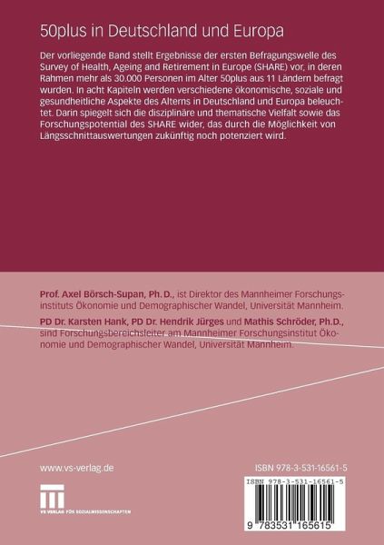 Prof. Axel Börsch-Supan, Ph.D., ist Direktor des Mannheimer Forschungsinstituts Ökonomie und Demographischer Wandel, Universität Mannheim. PD Dr. Karsten Hank, PD Dr. Hendrik Jürges und Mathis Schröder, Ph.D., sind Forschungsbereichsleiter am Mannheimer Forschungsinstitut Ökonomie und Demographischer Wandel, Universität Mannheim.