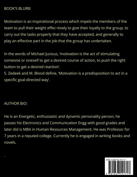 Motivation is an inspirational process that impels the members of the team to pull their weight effectively to give their loyalty to the group, to carry out the tasks properly that they have accepted, and generally to play an effective part in the job that the group has undertaken. In the words of Michael Jucious, 'motivation is the act of stimulating someone or oneself to get a desired course of action, to push the right button to get the desired reaction'. S. Zedeek and M. Blood define, 'Motivation is a predisposition to act in a specific goal-directed way'.