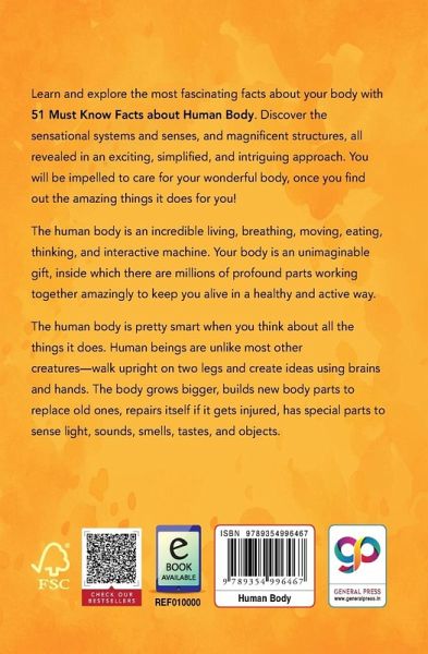 Learn and explore the most fascinating facts about your body with '51 Must Know Facts about Human Body'. Discover the sensational systems and senses, and magnificent structures, all revealed in an exciting, simplified, and intriguing approach. You will be impelled to care for your wonderful body, once you find out the amazing things it does for you! The human body is an incredible living, breathing, moving, eating, thinking, and interactive machine. Your body is an unimaginable gift, inside which there are millions of profound parts working together amazingly to keep you alive in a healthy and active way. The human body is pretty smart when you think about all the things it does. Human beings are unlike most other creatures-walk upright on two legs and create ideas using brains and hands. The body grows bigger, builds new body parts to replace old ones, repairs itself if it gets injured, has special parts to sense light, sounds, smells, tastes, and objects. Other Books in this Series: 51 Must Know Facts About Brain, ISBN : 9789354994371 51 Must Know Facts About Albert Einstein, ISBN : 9789354991486