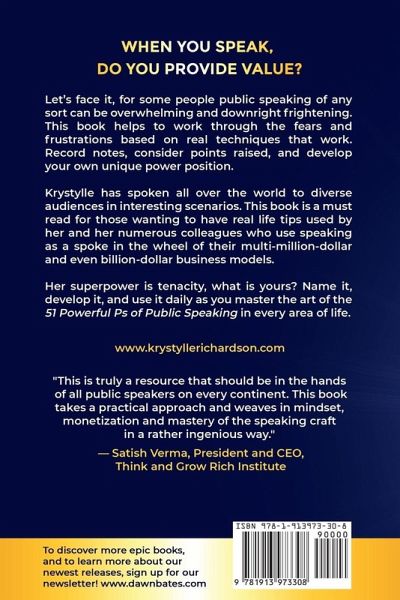 WHEN YOU SPEAK, DO YOU PROVIDE VALUE? Krystylle has spoken all over the world to diverse audiences in interesting scenarios. This book is a must read for those wanting to have real life tips used by her and her numerous colleagues who use speaking as a spoke in the wheel of their multi-million-dollar and even billion-dollar business models. This book was written to give you the reader insight and wisdom not just opinion. It is outlined into 6 'Power Positions' to make it easier to work through from preparation to the definition of power into primetime and beyond. The Power Positions are an excellent way to segment all of the valuable things needed into bite sized pieces. Let's face it, for some people public speaking of any sort can be overwhelming and downright frightening. This book helps to work through the fears and frustrations based on real techniques that work. Although Krystylle will not be using the names of the people she has interviewed and heard speak, you can easily find this information on her website KrystylleRichardson.com and TV/Radio show sites. The point of this book is not about name dropping but rather what the experiences of these leaders have taught us. It is Krystylle's hope that you jump in with both feet, an open mind, sleeves rolled up and ready to put pen to paper. Record notes, consider points raised, and develop your own unique power position. Her superpower is tenacity, what is yours? Name it, develop it, and use it daily as you master the art of the 51 Powerful Ps of Public Speaking in every area of life.