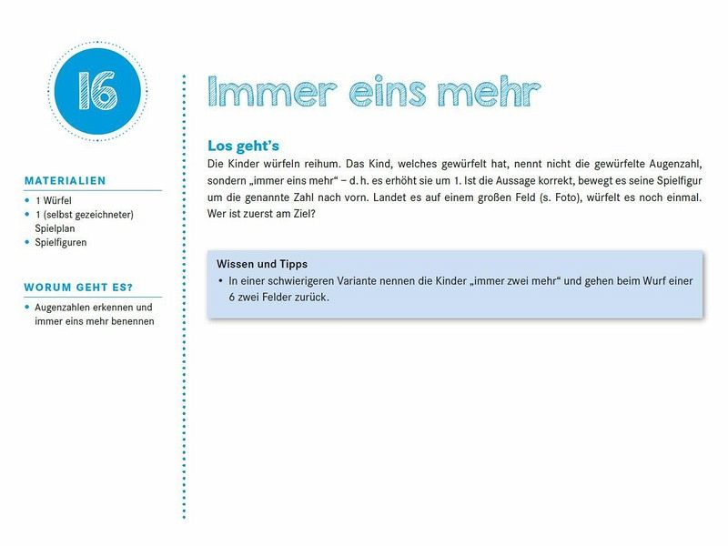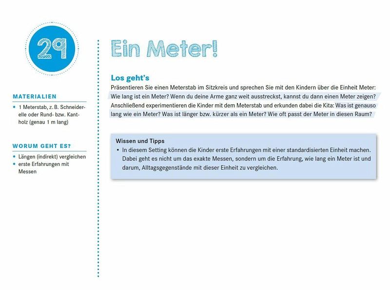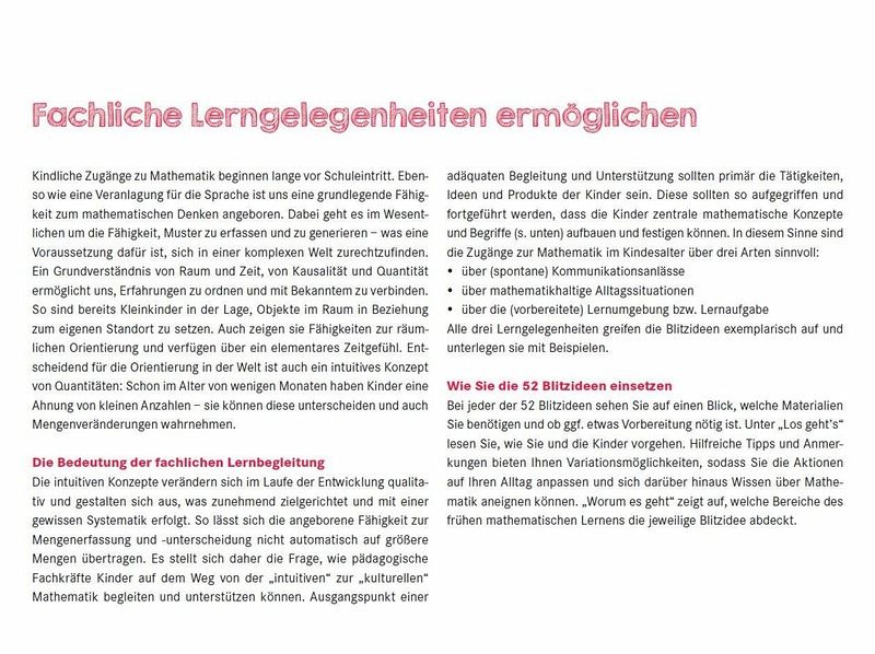 52 Ideen für ein ganzes Jahr im kompakten Kalenderformat - rund um das Thema "Mathe". Großformatige Fotos und kurze Anleitungen sorgen für einen einfachen Einsatz im Kita-Alltag: Die Ideen erfordern keine langen Vorbereitungszeiten, sind schnell zu erfassen und umzusetzen. Die vorgestellten Impulse unterstützen Kita-Kinder ab 3 Jahren in ihrer Entwicklung früher mathematischer Kompetenzen und ermuntern sie zu einem spielerischen Umgang mit Mathematik. Hier legen die Kinder Muster, würfeln, sortieren und ordnen, zählen, messen, machen Fingerspiele und Zählreime.