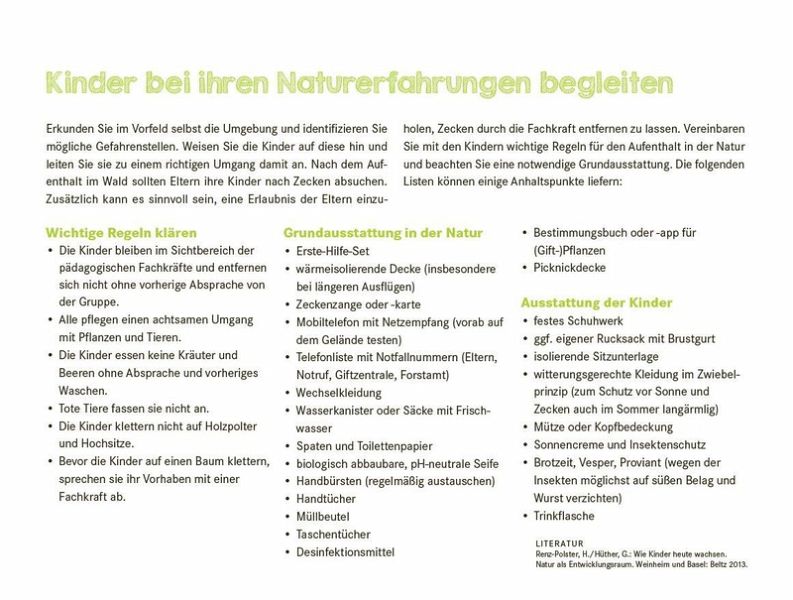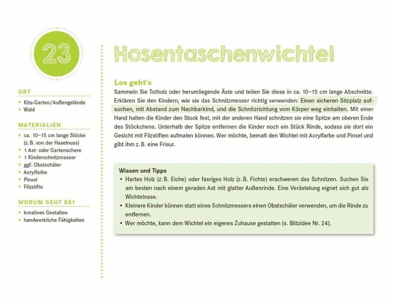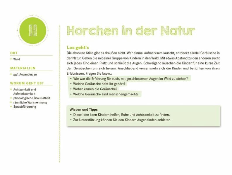 52 Ideen für ein ganzes Jahr im kompakten Kalenderformat - rund um das Thema "Natur". Großformatige Fotos und kurze Anleitungen sorgen für einen einfachen Einsatz im Kita-Alltag: Die Ideen erfordern keine langen Vorbereitungszeiten, sind schnell zu erfassen und umzusetzen. Die vorgestellten Impulse zeigen auf, wie Kita-Kinder ab 3 Jahren sinnliche Erfahrungen in der Natur sammeln können. Ganz nebenbei vermitteln die Praxisimpulse auch Bildung für nachhaltige Entwicklung. Hier ernten die Kinder Obst, beobachten Tiere, legen Kräuterbeete an, bauen mit Hölzern, springen in Pfützen, klettern auf Bäume, gestalten Naturtattoos, konstruieren einen Staudamm und schnitzen Wichtel.