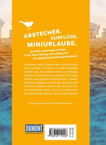 Ob wandern, radeln, paddeln oder in aller Ruhe die Natur genießen: 52 kleine und große Eskapaden machen Lust, die schönsten Ecken in Schleswig-Holstein an der Nordsee zu entdecken. Für wenige Stunden, einen Tag oder ein Wochenende - unwiderstehliche Ausflüge ins Grüne warten. Meeresspargel sammeln, im Wasser wandern oder mit dicken Pötten um die Wette radeln - es ist so einfach, mehr zu erleben als das Bekannte. Also ab nach draußen!