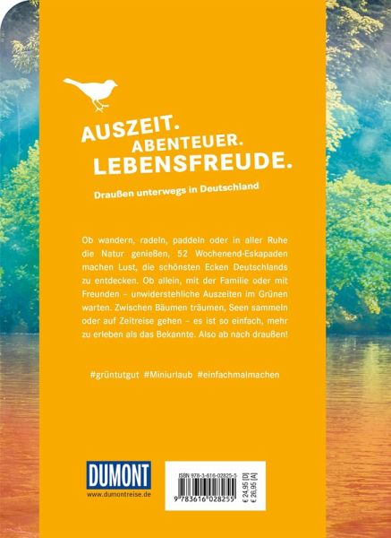 Wer kurz dem Alltagstrott entkommen, Kraft tanken und Neues erleben möchte, der muss nicht weit reisen. Traumhafte Seen, dichte Wälder, atemberaubende Ausblicke und Burgen wie aus dem Märchen liegen direkt um die Ecke in ganz Deutschland. Ob wandern, radeln, paddeln oder in aller Ruhe die Natur genießen, für den nächsten Wochenendtrip ist unter den 52 vielseitigen Draußen-Eskapaden auf jeden Fall die passende Auszeit dabei. Für zwei oder drei Tage - die schönsten Ecken Deutschlands warten darauf, ausführlich erkundet zu werden. Unter Sternen träumen auf Amrum, mit dem Hausboot auf der Havel schippern, Schlösser und Burgen auf dem Werra-Burgen-Steig erobern oder Schäfchen zählen auf der Schwäbischen Alb - es ist so einfach, mehr zu erleben als das Bekannte.