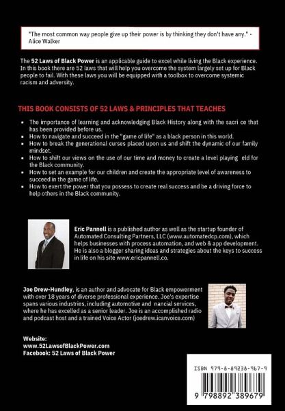 52 Laws of Black Power is a transformative guide designed to empower individuals in the Black community to navigate and overcome systemic challenges while building personal and generational success. Through 52 actionable principles, the book offers practical advice on how to break generational curses, shift mindsets, and achieve financial literacy and equity. It emphasizes the importance of understanding Black history, recognizing the sacrifices of those who came before, and setting a legacy for future generations. This book is more than just a self-help guide; it is a call to action to reevaluate the use of time, resources, and community connections. It inspires readers to harness their personal power to excel in a world often fraught with obstacles while staying true to their cultural identity. Each law is presented as a step towards creating a life of purpose, fulfillment, and empowerment, encouraging readers to lead by example and contribute positively to their communities. With its motivational tone and practical insights, 52 Laws of Black Power is an essential read for anyone seeking to embrace their potential and inspire change, not only within themselves but also in the world around them. Whether you're looking to overcome personal struggles, set new standards for success, or leave a lasting legacy, this book provides the roadmap to get there. It is a powerful tool for personal development, cultural awareness, and collective empowerment.
