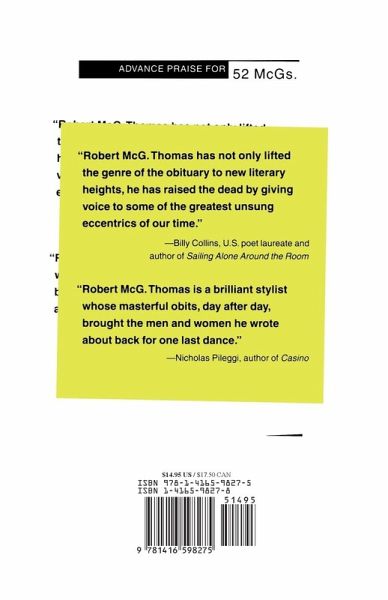 Among his devoted fans, his pieces were known simply as McGs. With a "genius for illuminating that sometimes ephemeral apogee in people's lives when they prove capable of generating a brightly burning spark" (Columbia Journalism Review), Robert McG. Thomas Jr. commemorated fascinating, unconventional lives with signature style and wit. The New York Times received countless letters over the years from readers moved to tears or laughter by a McG. Eschewing traditionally famous subjects, Thomas favored unsung heroes, eccentrics, and underachievers, including: Edward Lowe, the inventor of Kitty Litter ("Cat Owner's Best Friend"); Angelo Zuccotti, the bouncer at El Morocco ("Artist of the Velvet Rope"); and Kay Halle, a glamorous Cleveland department store heiress who received sixty-four marriage proposals ("An Intimate of Century's Giants"). In one of his classic obituaries, Thomas described Anton Rosenberg as a "storied sometime artist and occasional musician who embodied the Greenwich Village hipster ideal of 1950's cool to such a laid-back degree and with such determined detachment that he never amounted to much of anything." Thomas captured life's ironies and defining moments with elegance and a gift for making a sentence sing. He had an uncanny sense of the passion and personality that make each life unique, and the ability, as Joseph Epstein wrote, to "look beyond the facts and the rigid formula of the obit to touch on a deeper truth." Compiled by Chris Calhoun, one of Thomas's most dedicated readers, and with a fittingly sharp introduction from acclaimed novelist and critic Thomas Mallon, 52 McGs. will win legions of new fans to the masterful writer who transformed the obituary into an art form.