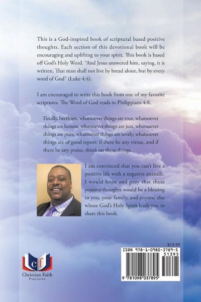 This is a God-inspired book of scriptural based positive thoughts. Each section of this devotional book will be encouraging and uplifting to your spirit. This book is based off God's Holy Word. "And Jesus answered him, saying, it is written, That man shall not live by bread alone, but by every word of God" (Luke 4:4). I am encouraged to write this book from one of my favorite scriptures. The Word of God reads in Philippians 4:8, Finally, brethren, whatsoever things are true, whatsoever things are honest, whatsoever things are just, whatsoever things are pure, whatsoever things are lovely, whatsoever things are of good report; if there be any virtue, and if there be any praise, think on these things. I am convinced that you can't live a positive life with a negative attitude. I would hope and pray that these positive thoughts would be a blessing to you, your family, and anyone else whose God's Holy Spirit leads you to share this book.